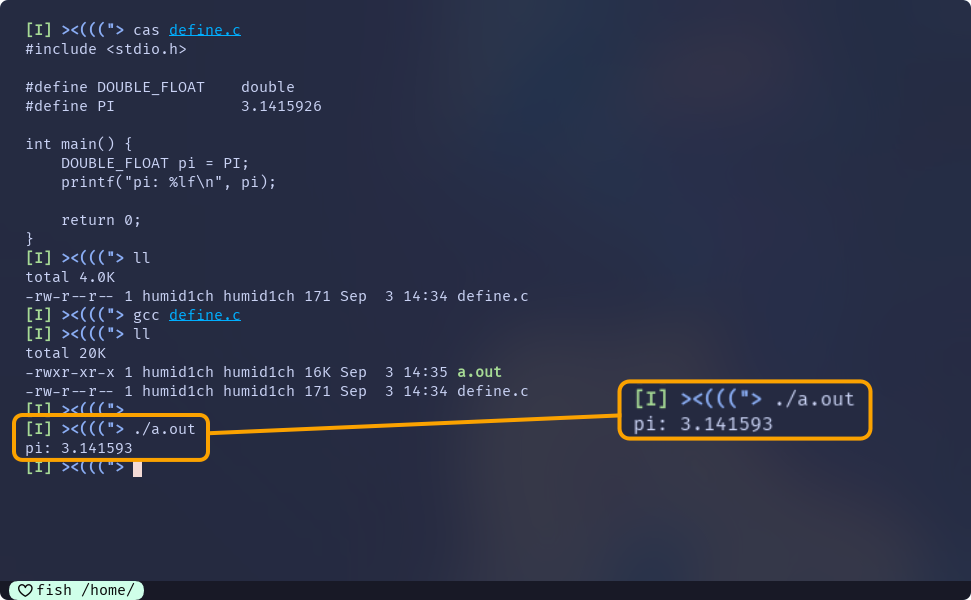 #include <stdio.h> #define DOUBLE_FLOAT double #define PI 3.1415926 int main() { DOUBLE_FLOAT pi = PI; printf("pi: %lf\n", pi); return 0; }