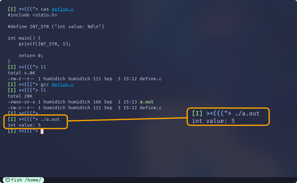 #include <stdio.h> #define INT_STR "int value: %d\n" int main() { printf(INT_STR, 5); return 0; }
